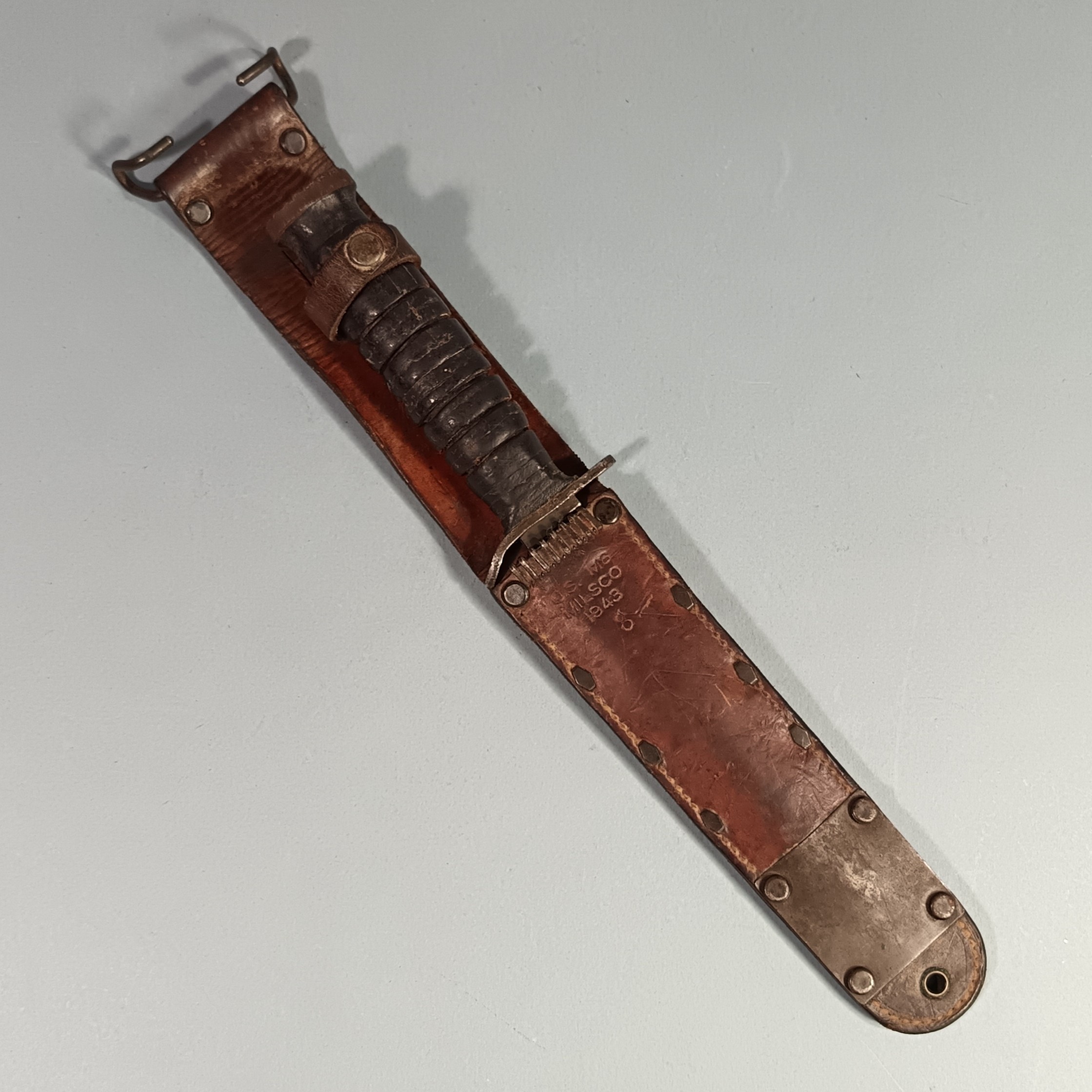 COUTEAU DE COMBAT USM3 UTICA MARQUAGE GARDE ET MATRICULE AVEC FOURREAU CUIR USM6 MILSCO 1943