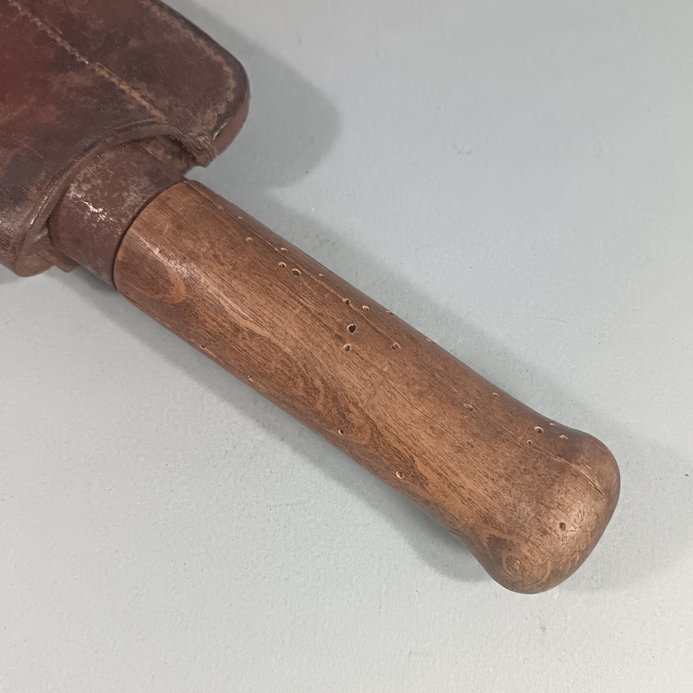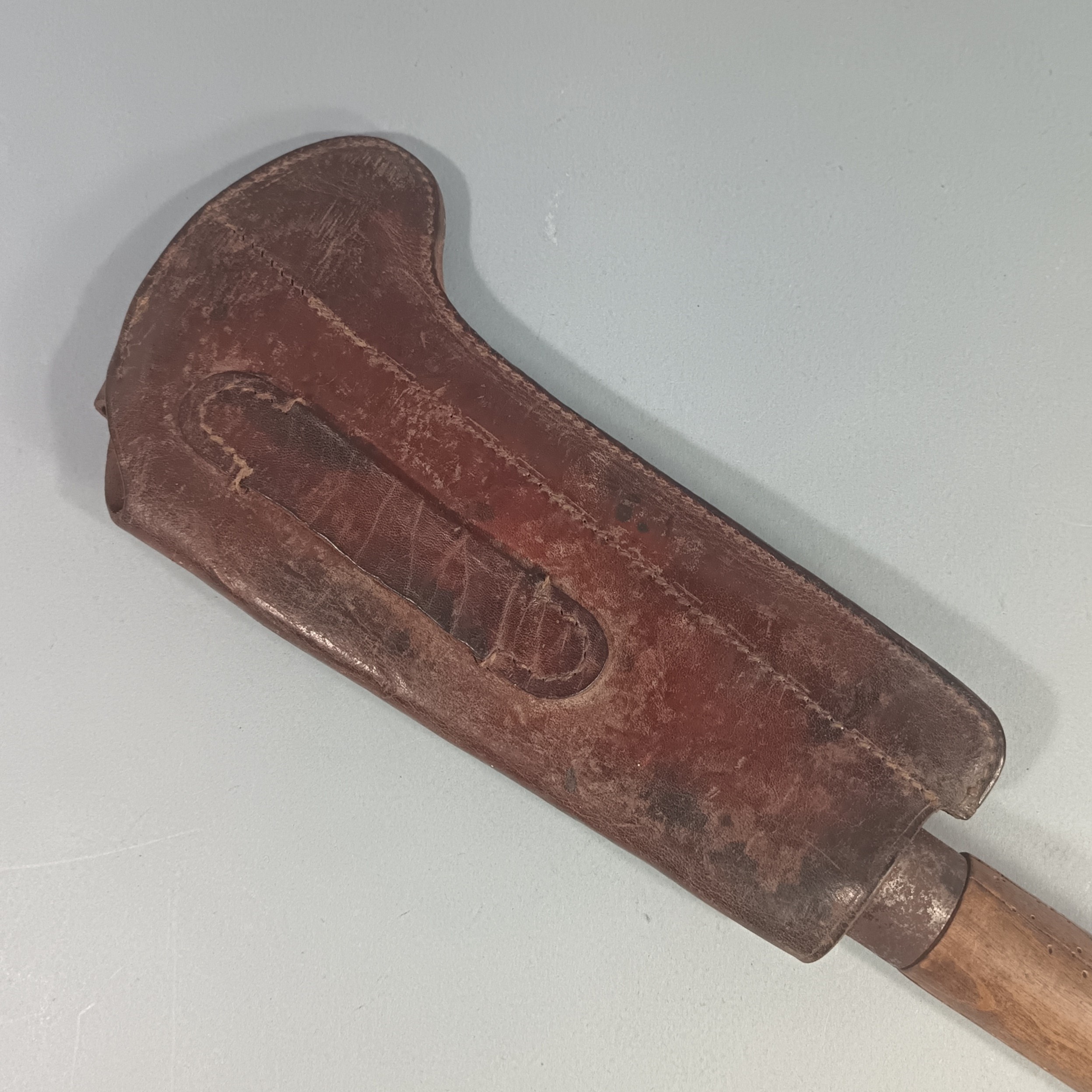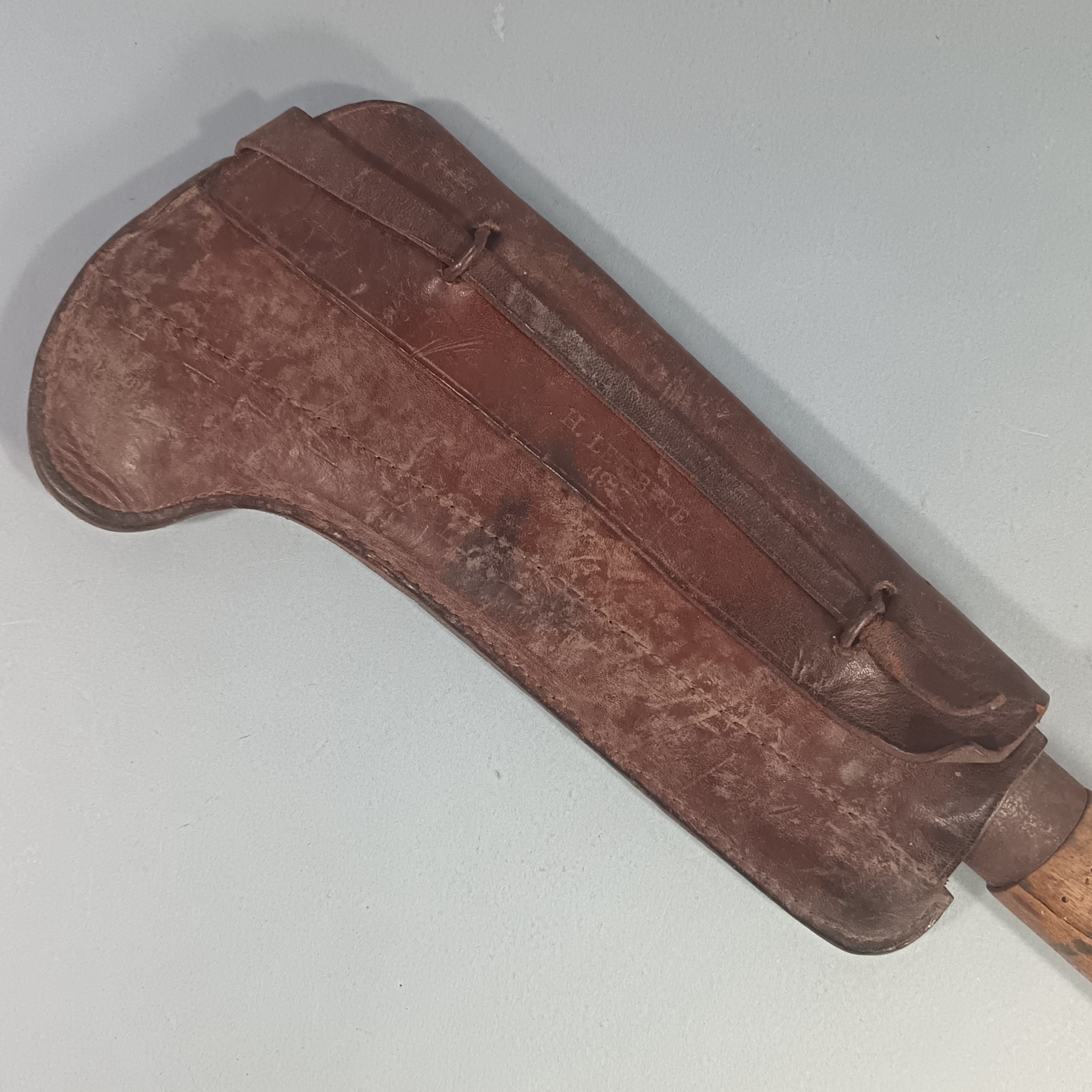 OUTIL MILITAIRE SERPE INDIVIDUELLE EQUIPEMENT DE SOLDAT GUERRE 1914 1918 OU 1939 145 CUIR DATE 1917 ET SERPE 1922