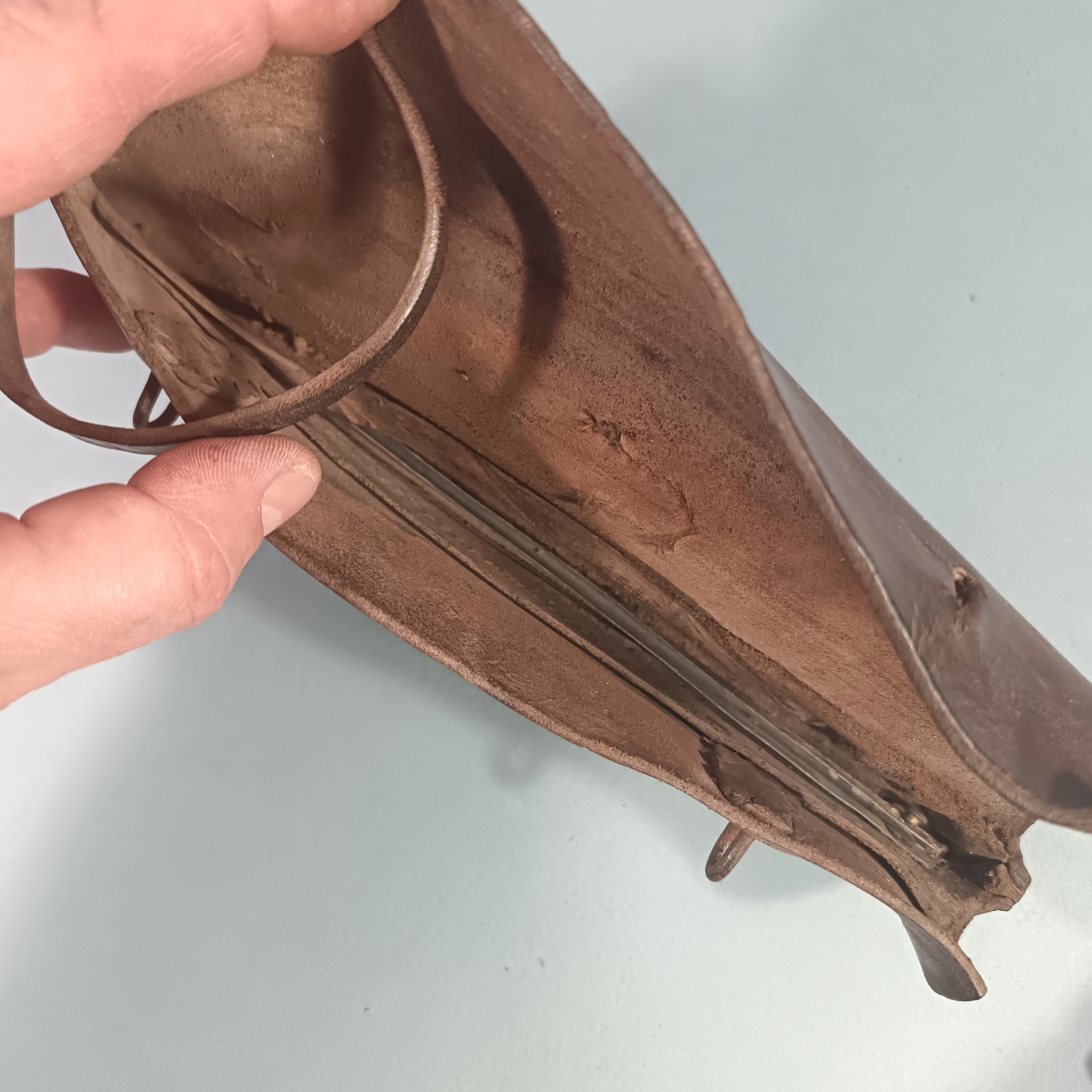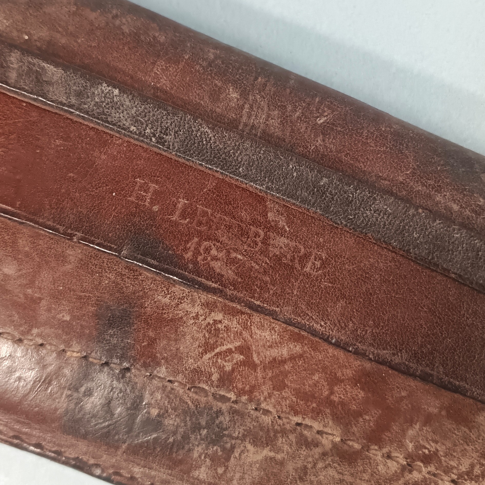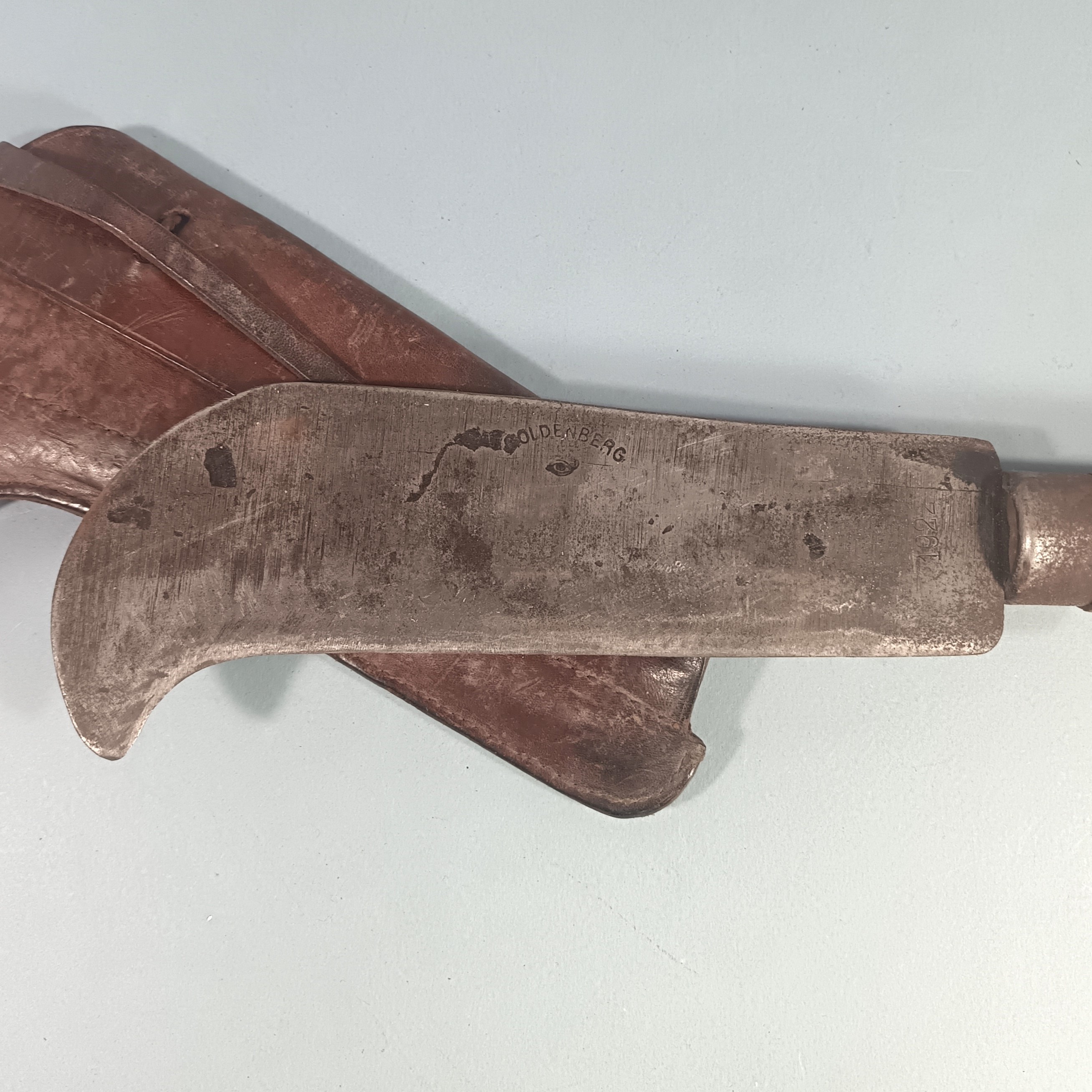 OUTIL MILITAIRE SERPE INDIVIDUELLE EQUIPEMENT DE SOLDAT GUERRE 1914 1918 OU 1939 145 CUIR DATE 1917 ET SERPE 1922