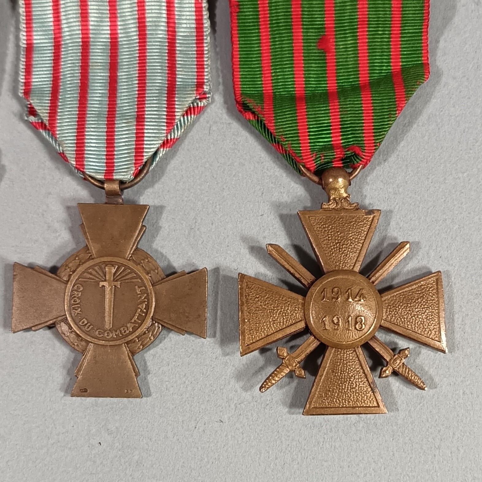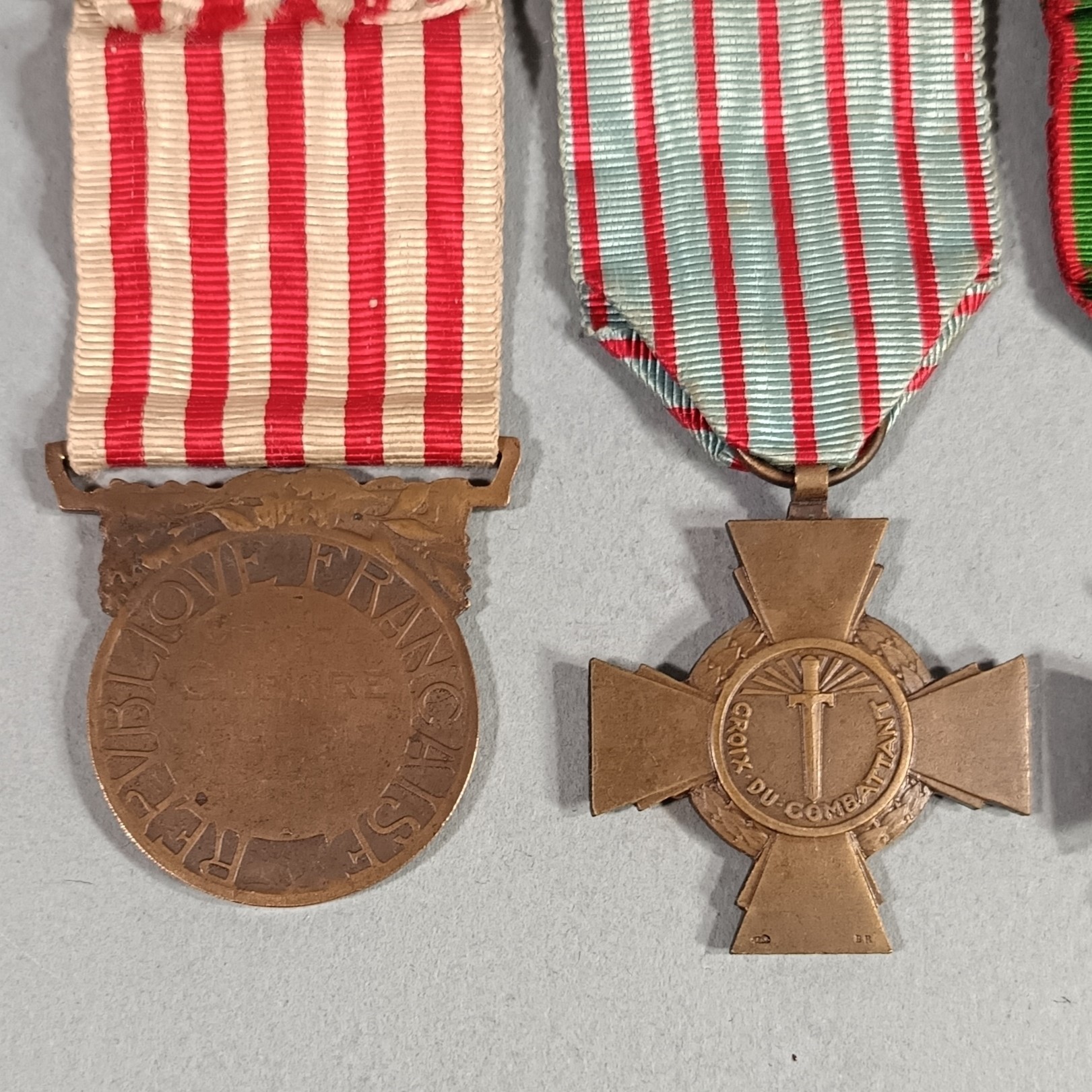 ENSEMBLE GUERRE 1914 1918 3 MEDAILLES SUR UNE BARRETTE A BOULES CROIX DE GUERRE 1914 1918 CROIX COMBATTANT ET GRANDE GUERRE